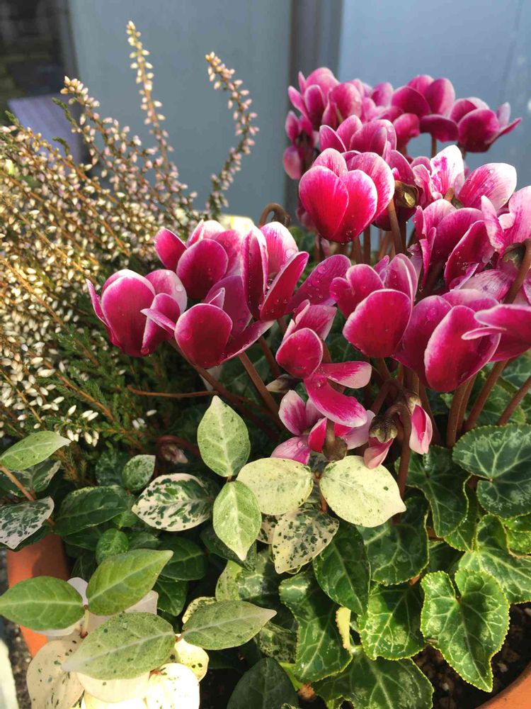 フラワーウッドさんでお安くなっていた、ガーデンシクラメンやハツユキカヅラ、近所のHCでお迎えしたカルーナで寄せ植えしました🌸