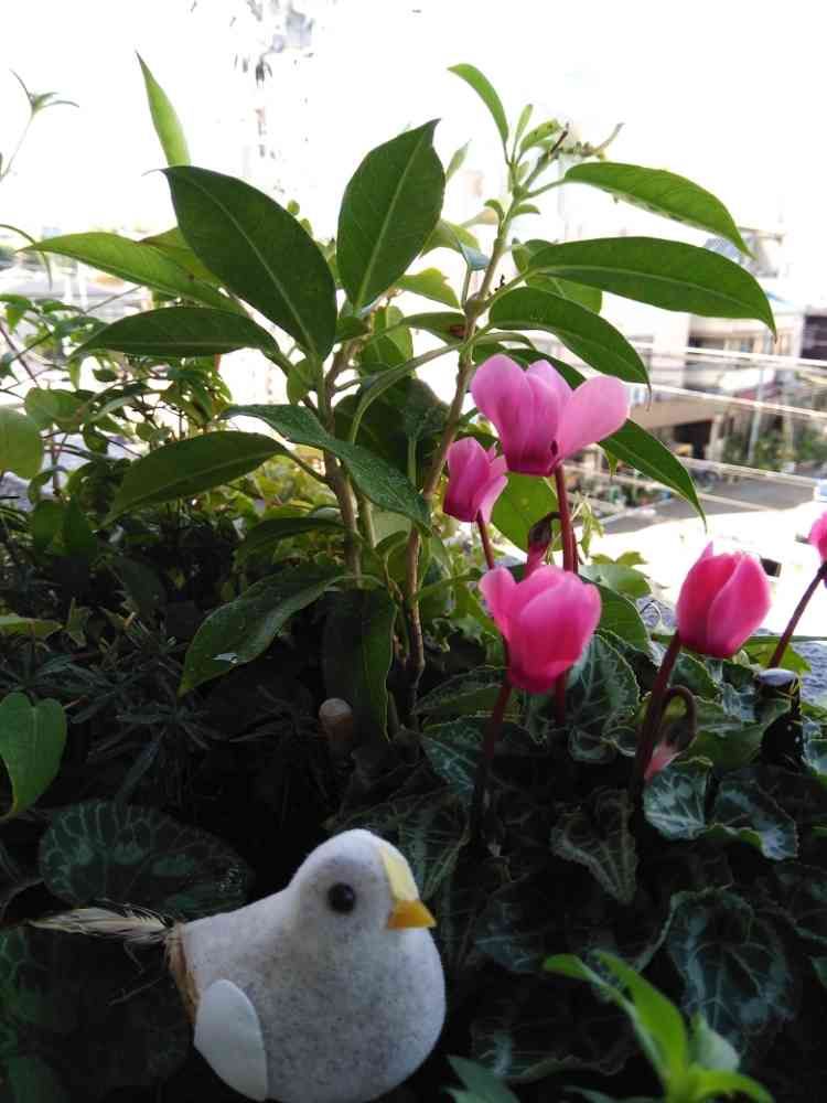 ミニシクラメンと小鳥さんが緑に囲まれて綺麗ですねぇ💐