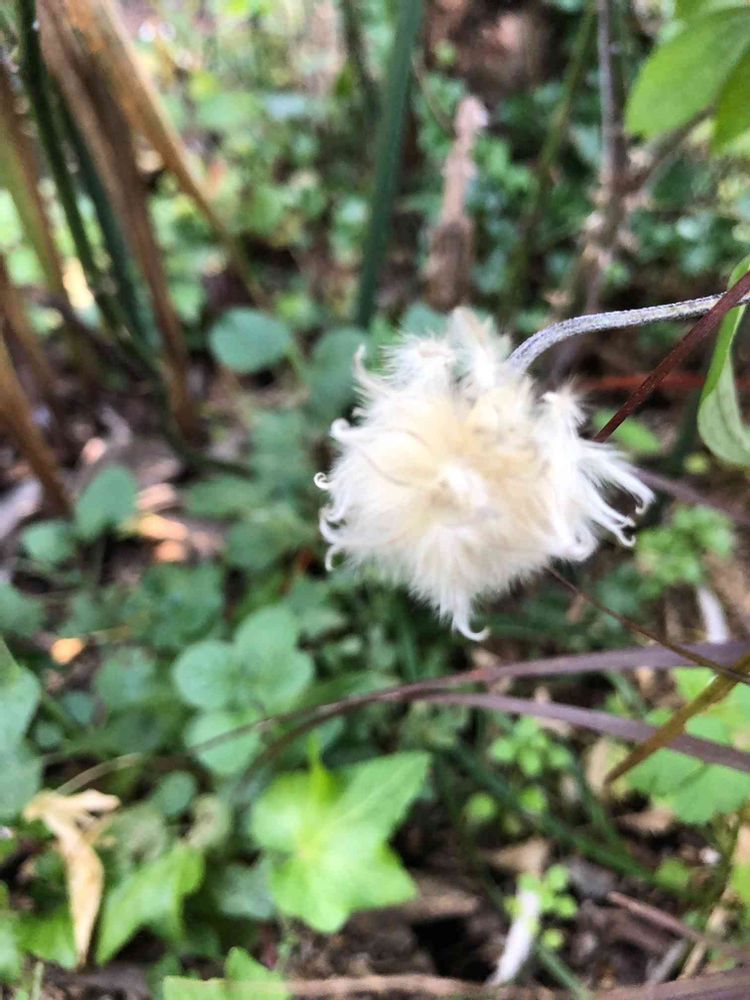 枯れ葉の間からクレマチス クリルの綿毛がそっと顔をのぞかせていました✨
