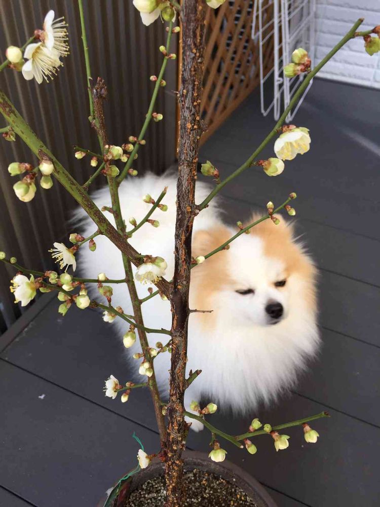 そこかしこで梅が咲き始めましたね、我が家の梅も一際大きな花が咲きました、って、犬かーい!