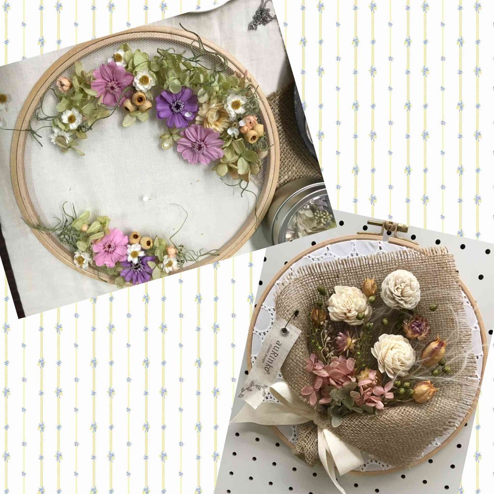 刺繍のフレームなので色々なサイズもあり布地を変えたり、アレンジの花材も色々使えて幅広い作品が作れるそうです💓