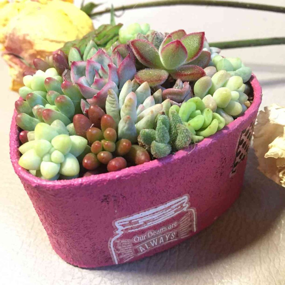 娘が買った物だと思うんですが、ハート型の缶見つけて〰〰すぐに、ピンクに塗って多肉ちゃん達詰めちゃいました(((o(*゚▽゚*)o)))♡🎵💓💖