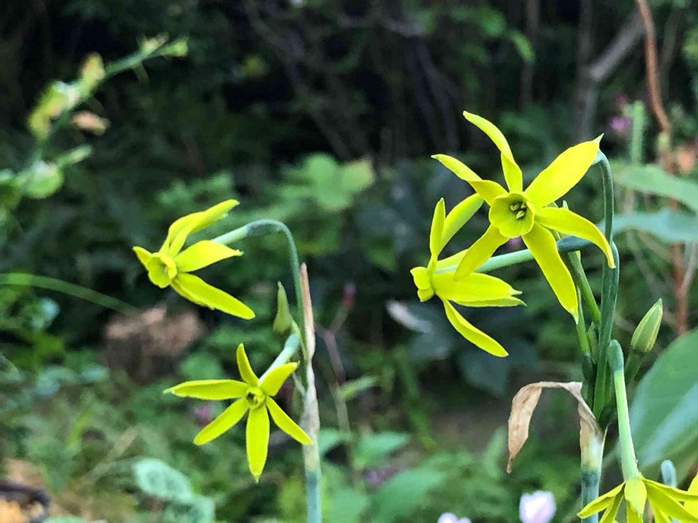 秋咲きのスイセン・オータムジュエルです。不思議な緑色の花で、甘くて強い香りがします。ニホンズイセンよりもキツイ感じの香りです😅。