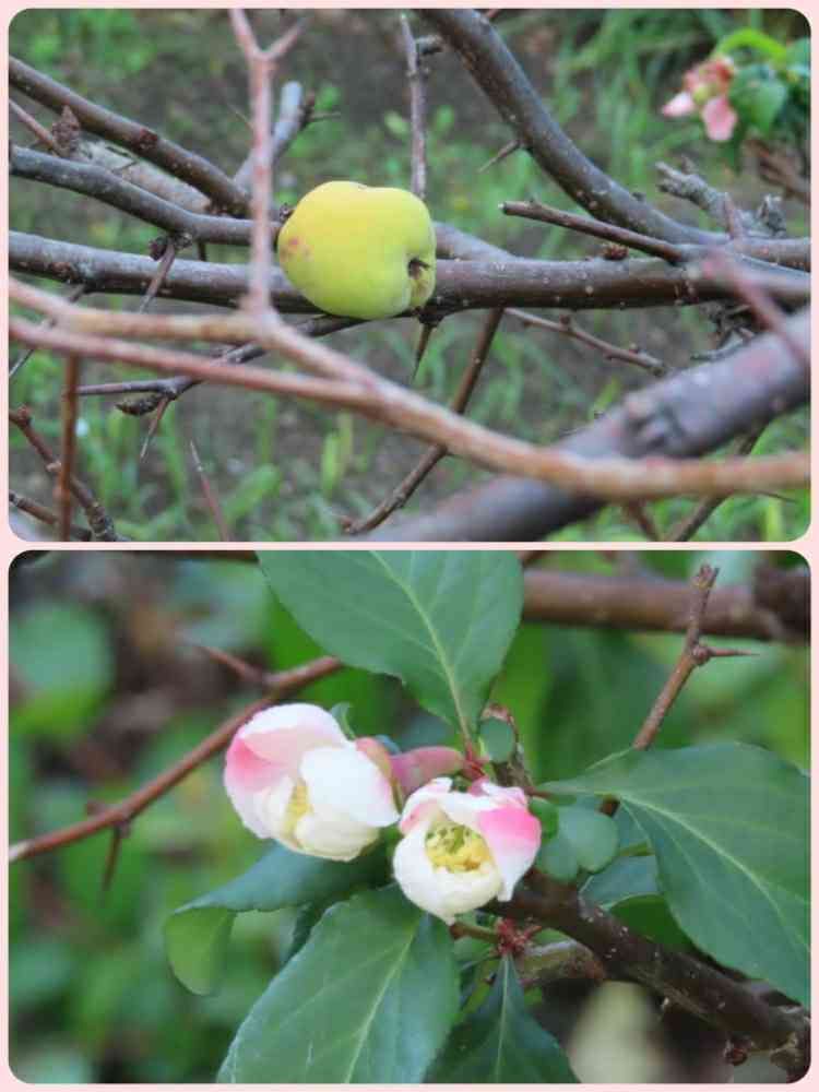 木瓜に立派な実がなっていましたが、同時に季節はずれの可愛いらしい花も咲いていました。