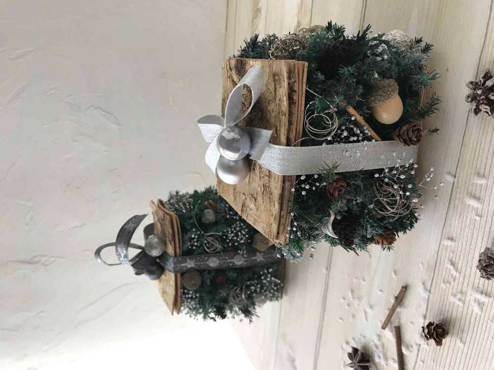 白樺皮にヒムロ杉や実物を挟んだアレンジをクリスマスを彩る