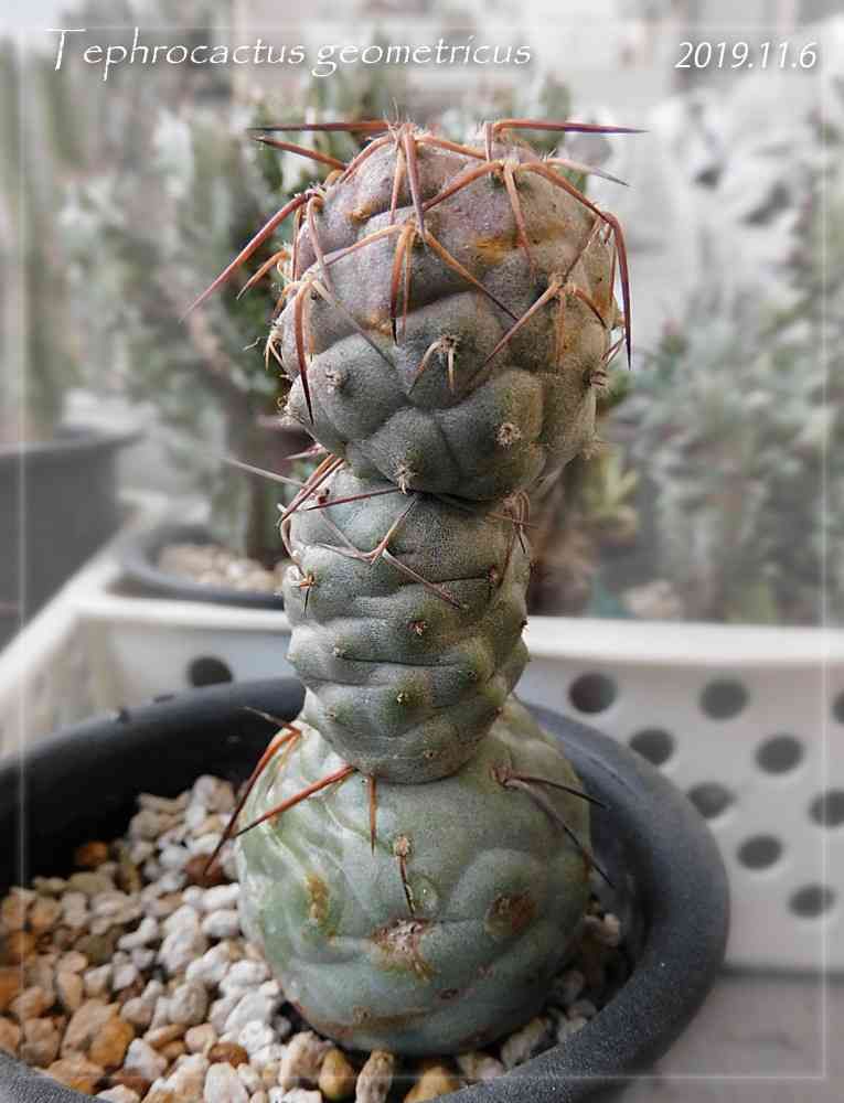 テフロカクタス、ゲオメトリクス。今年出てきた第三節もすっかり成長しきった様子。……水が足りないのか、2節目がちょっとしわくんでる。