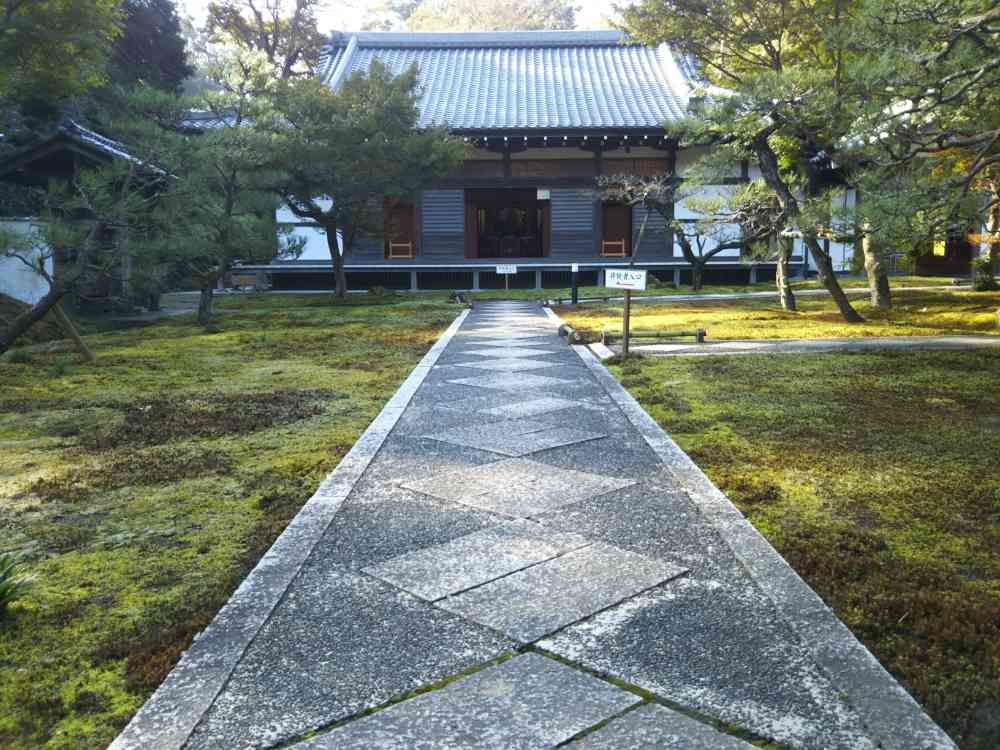 山門をくぐり、本堂前に広がるウマスギゴケのコケ庭園。
