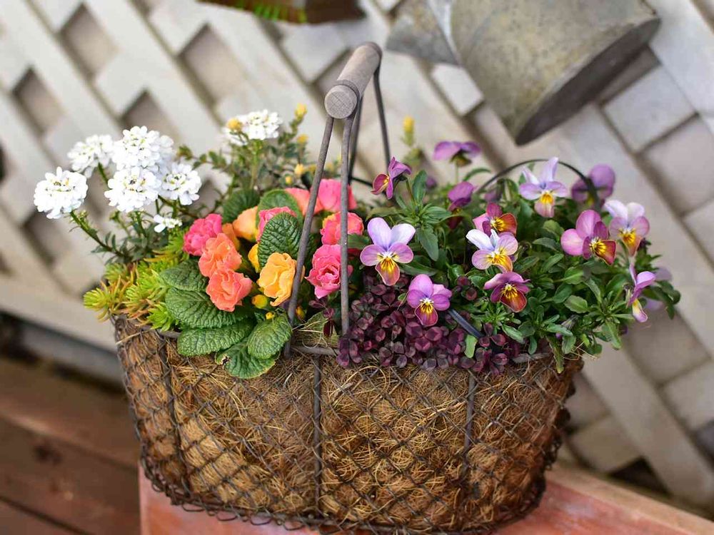 バラ咲きプリムラ・ジュリアン「ピーチフロマージュ」 のワイヤーバスケット寄せ。