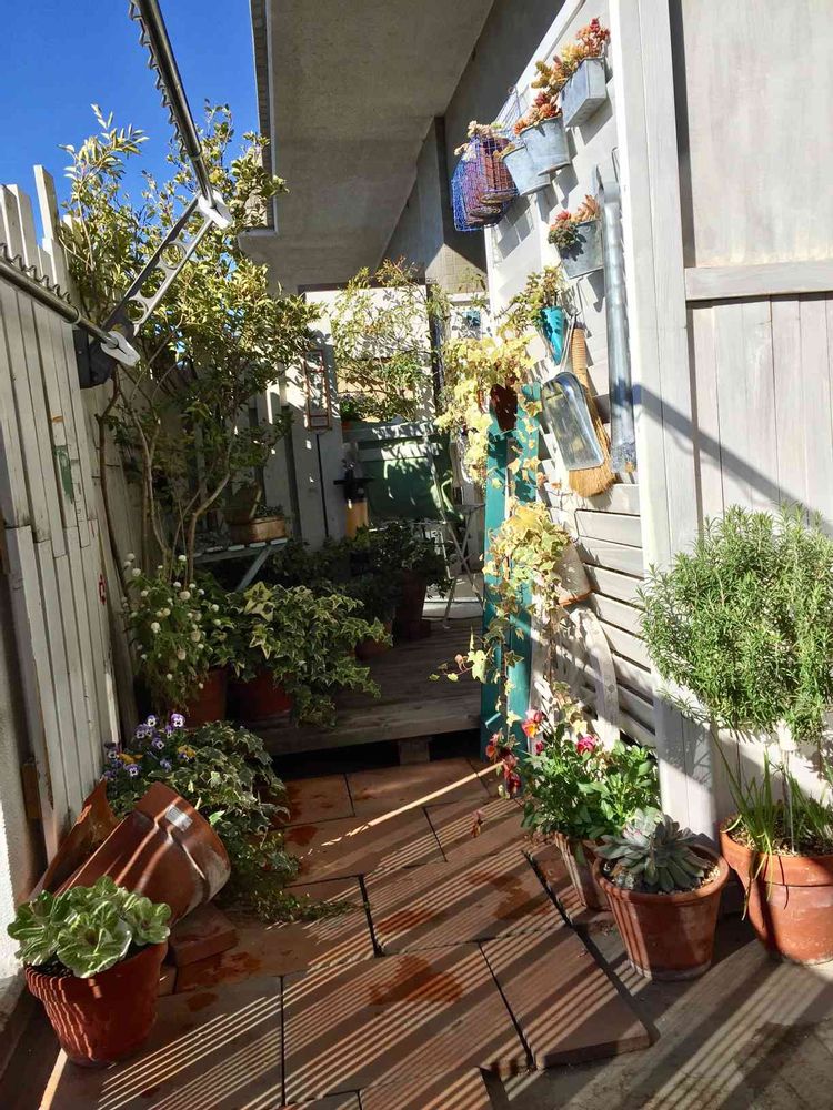マンションの小さなベランダでガーデニングを楽しんでいます。ウッドデッキ、ウッドフェンス、室外機カバーなどほとんどDIYしました。