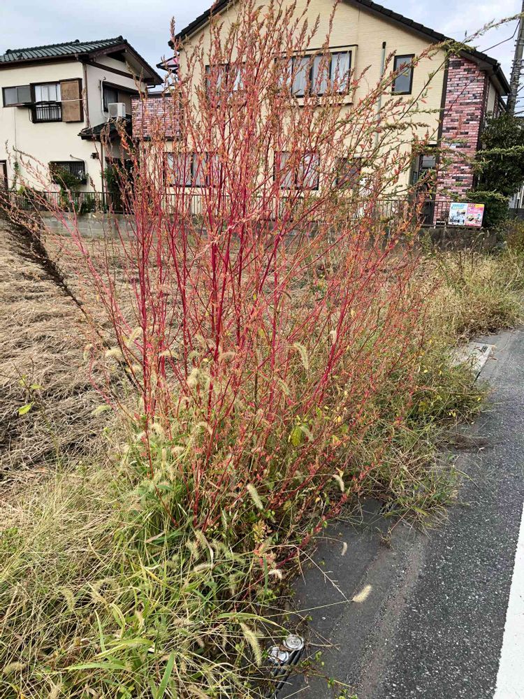 田んぼのあぜ道にある、かなり赤みの強い植物です(写真を撮ったのは1ヶ月くらい前、今は枯れて小さく横になっています)