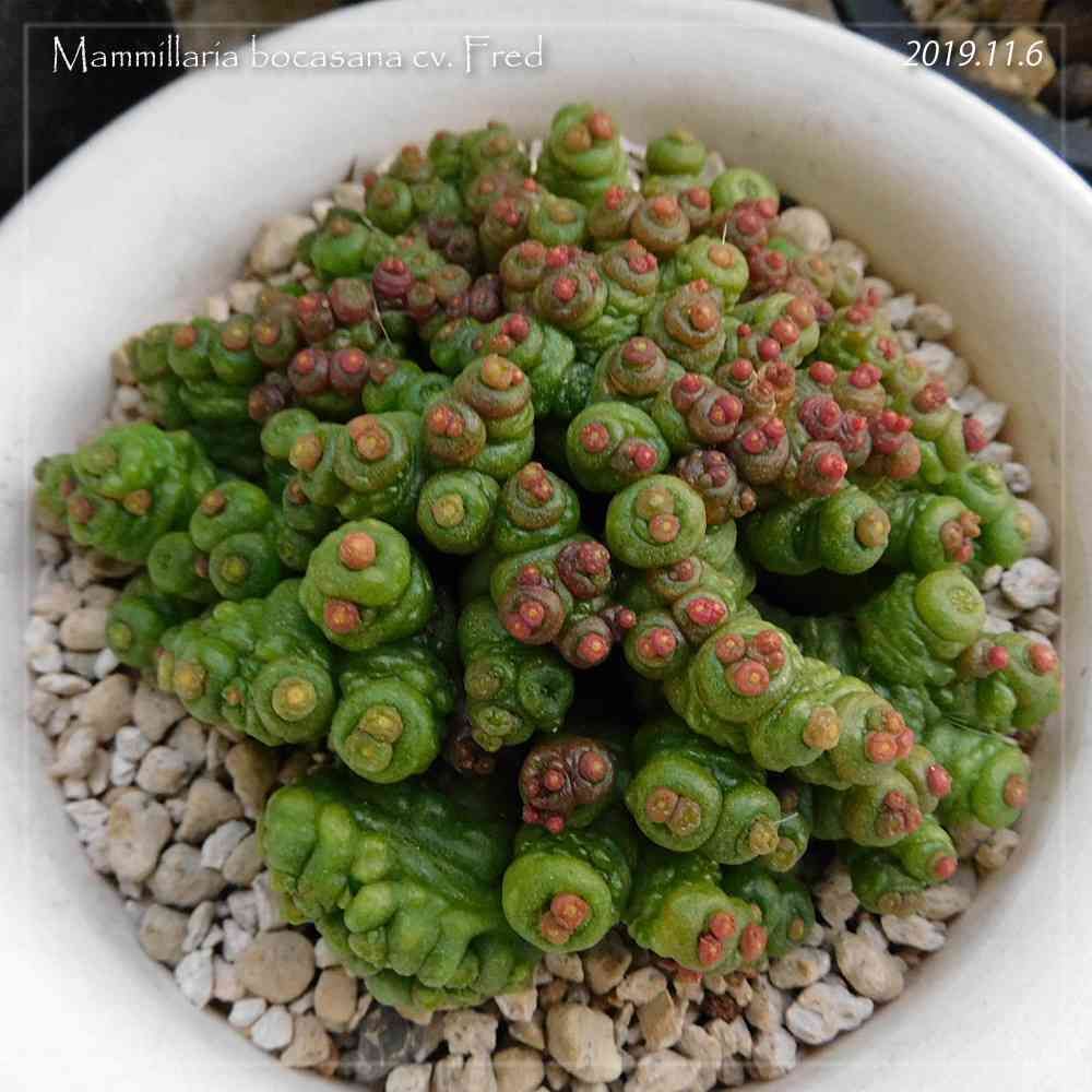 マミラリア、ボカサナ・フレッド。 いつもは緑なのに、今年は部分的に茶色。先端のつぶつぶが今後大きくなるので、成長はしているみたいだけど、なぜ茶色? 植え替えしたせい? それとも日焼け?