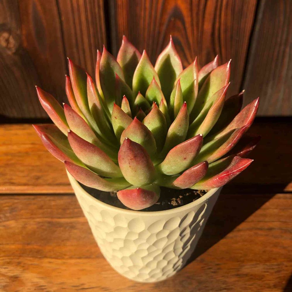 エケベリアのアガボイス(Agavoides)の系統は、爪が赤くなるクリスマス、クリスマスイブなどもあります。相府連や 花の宰相 は、全身が赤く染まります。