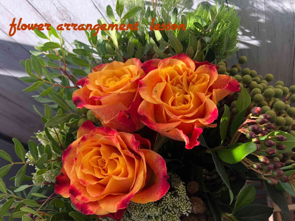 久しぶりのフラワーレッスン。オレンジ🍊の薔薇を活かすグリーンブーケ。