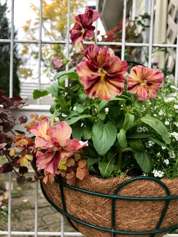 ちょいと、変わったパンジーですが、気に入ってます。百均で買ったハンギングバスケットも、使えるわ〜👍
