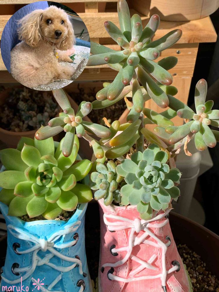 ありがとう(´∀`,,人)♥*.何故かこのシューズ鉢の多肉さん達は元気なんです😆🍀 前は恋心より乙女心をひいきしちゃってましたが( ´艸`)今はここまで元気に育ってくれた恋心も愛おしいです😋💗