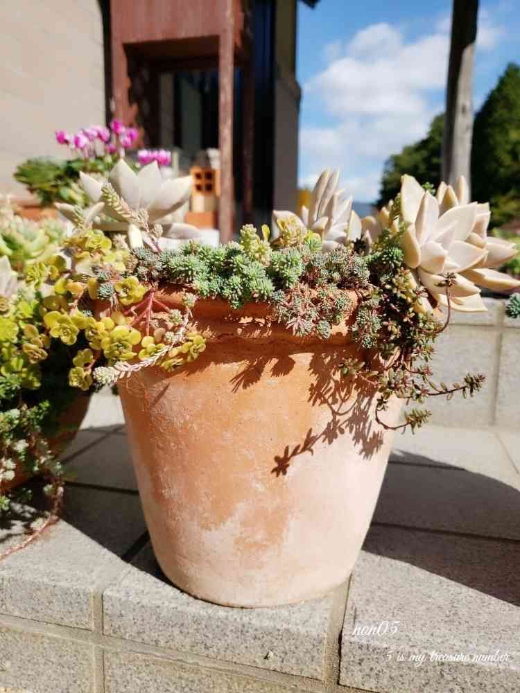 テラコッタの素焼き鉢に使い古した様な白いお粉と朧月&セダム達🌵とその影