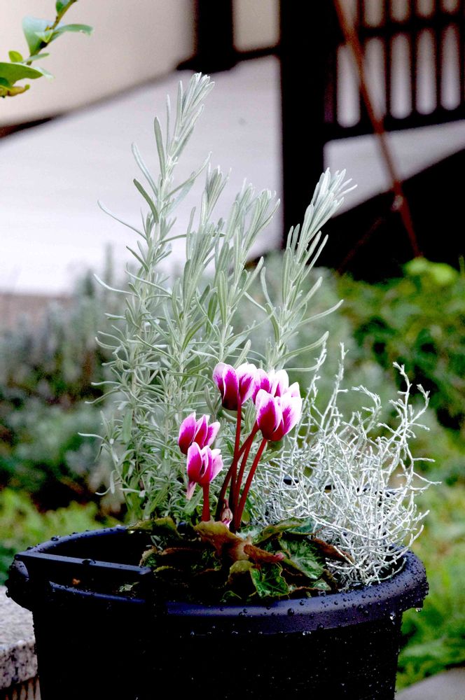 とてもお天気がよかったので、寄せ植えを作ってみました。黒いプラ鉢にシクラメンとラベンダーとプラチーナ。ほんのり良い香りがします。