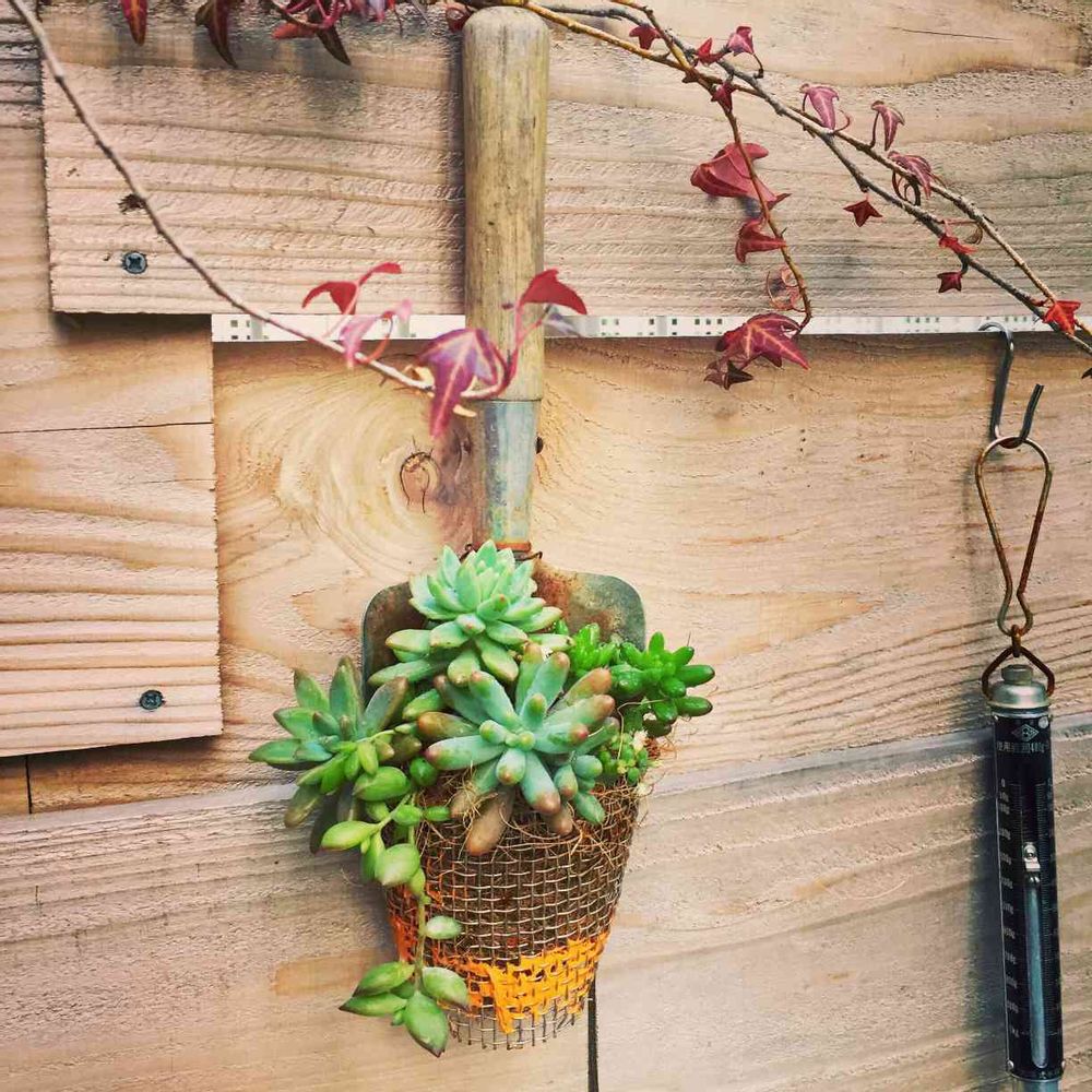 サビサビのスコップにオレンジの何かが付着したアミアミを巻き付けて寄せ植え。こういう変てこりんな物に植えても可愛い♥️