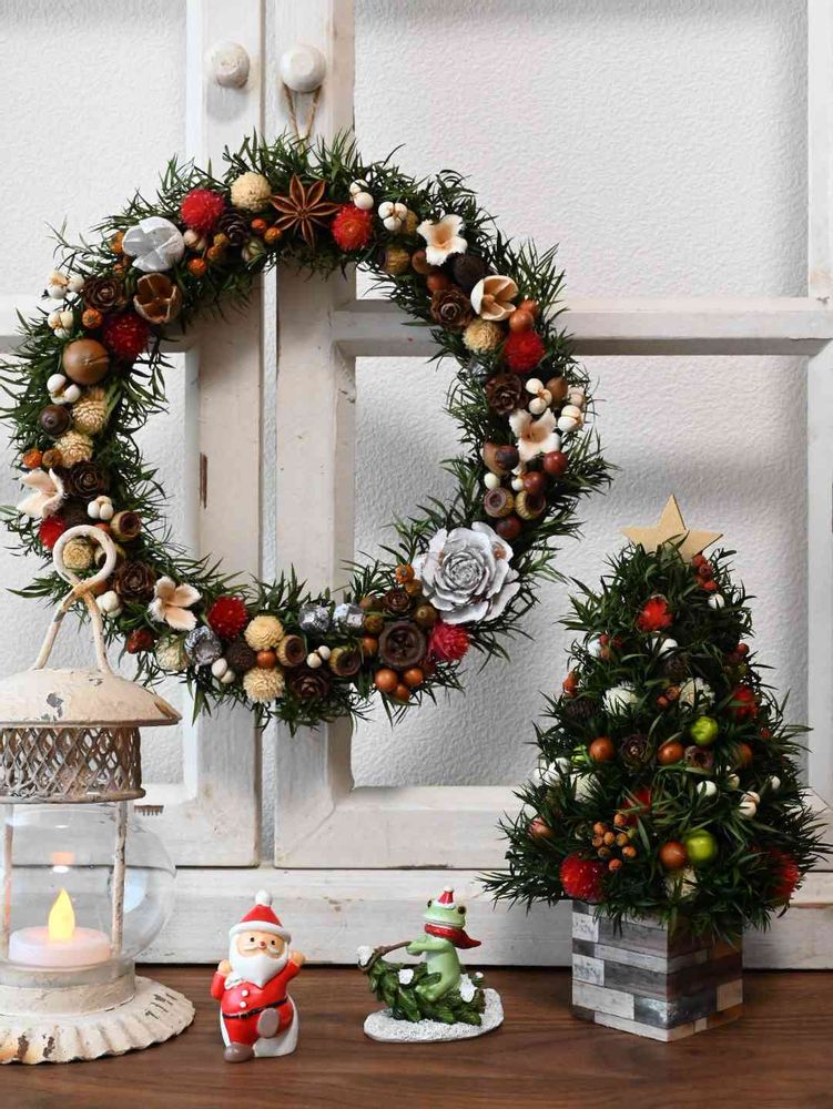 お花屋さんで5~6個の松ぼっくりでボール⚽みたくなっていてその隙間にお花や木の実などの飾り付けがありリボンで吊るしてありました✨