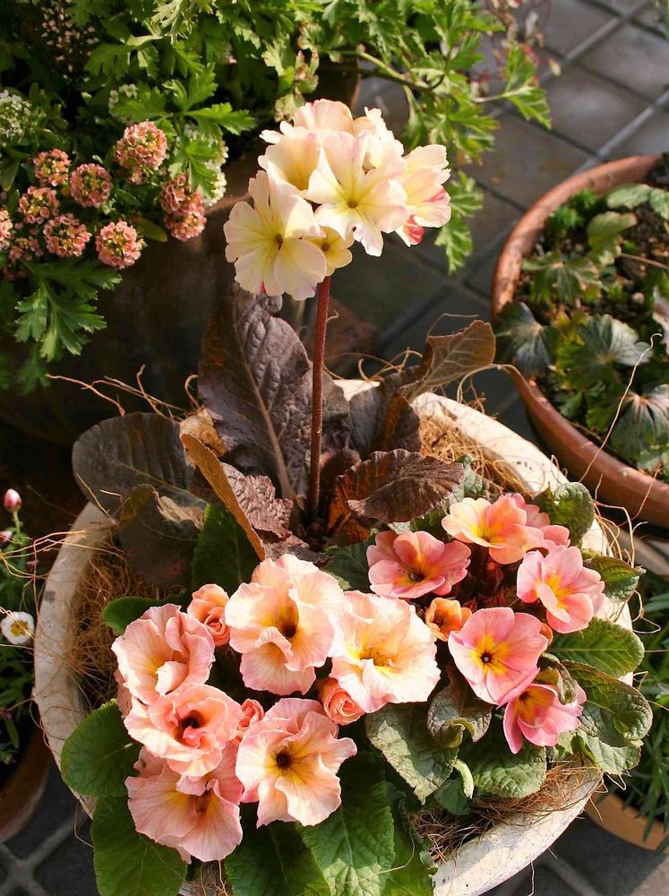プリムラ類の中で一番好きなジェシカ。ブロンズの葉っぱが何とも言えません。クラシックシリーズは他にも魅力的なお色がたくさんあって、選ぶのに時間がかかりました。シックなピンク系の組み合わせと、この黄色がかったかわいい系。いつも一緒に選んでくださるお店の奥さんと二人でさんざん迷って、これ!