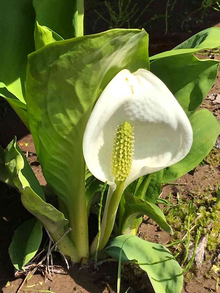 水芭蕉さんって、もっと、水っぽいところに咲くのかと思ってましたけど、けっこう固まってるっぽい土に咲くんですね💕
