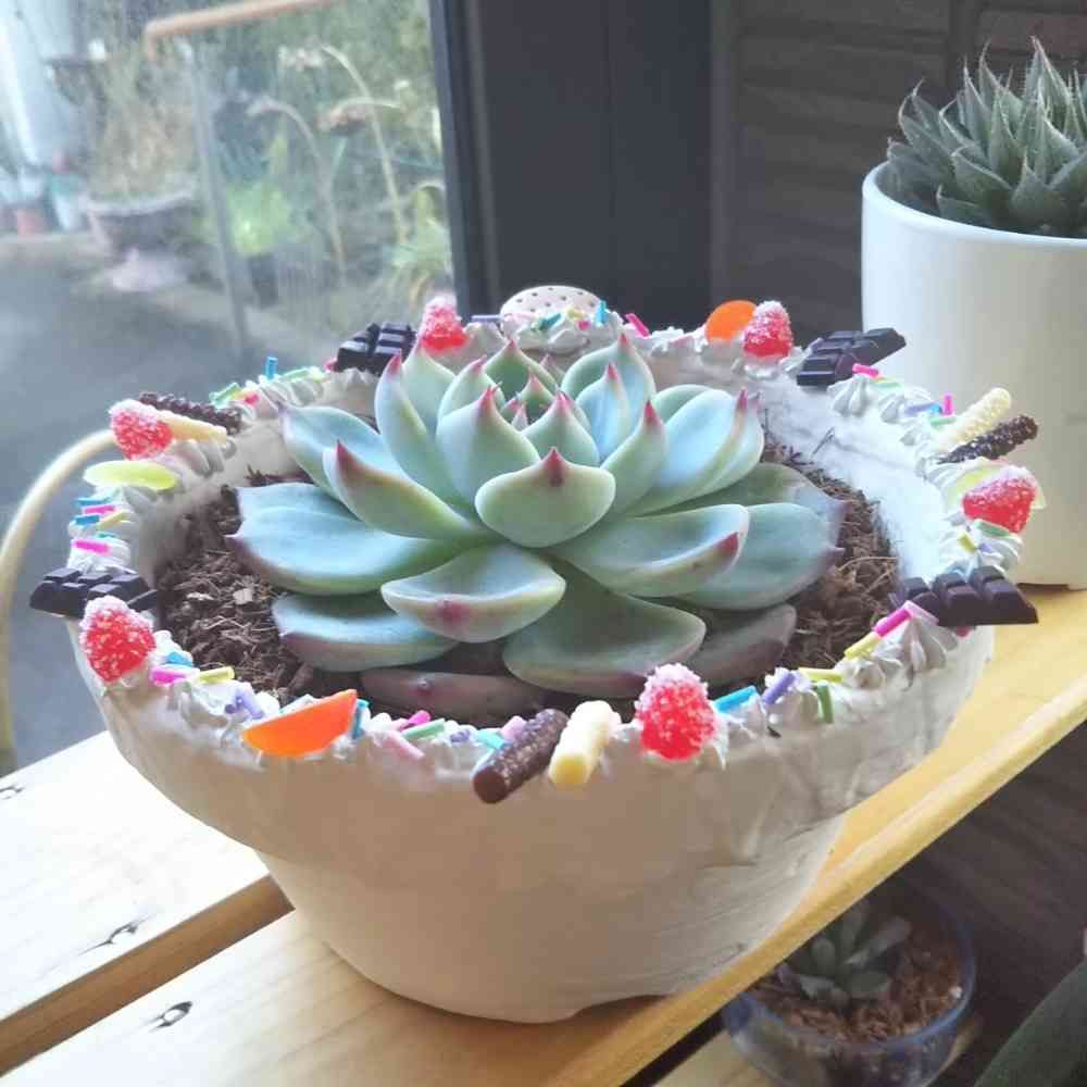 多肉の寄せ植え鉢をたくさん作った後ということもあるのですが、この鉢は桃太郎単独で植えると決めてここまでやってしまったので、隙間にセダムまで植えてしまうとケーキのデコパーツとケンカしてしまう(ゴチャゴチャし過ぎ)んじゃないかと 😅