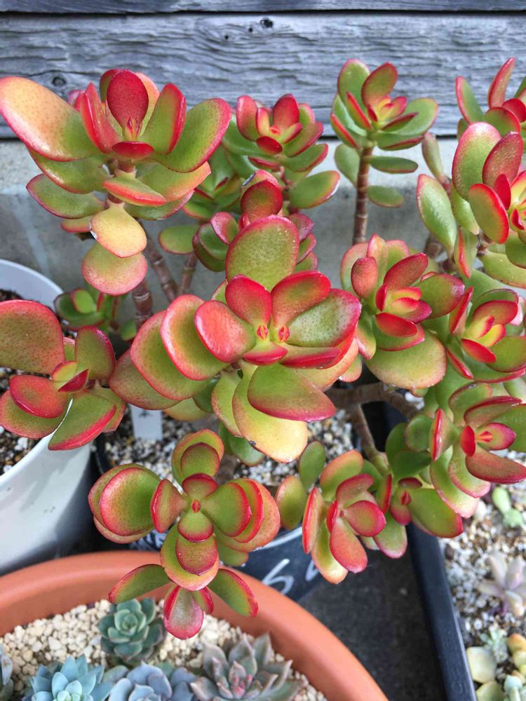 久しぶりです😄@マモンさんにも書きましたが、調べても病気とかじゃないみたいなので、安心しています!でも、やっぱり一年中赤いのは変わってますよね😅?他にも2つ小さい金の成る木がありますが、そっちは普通に緑です!