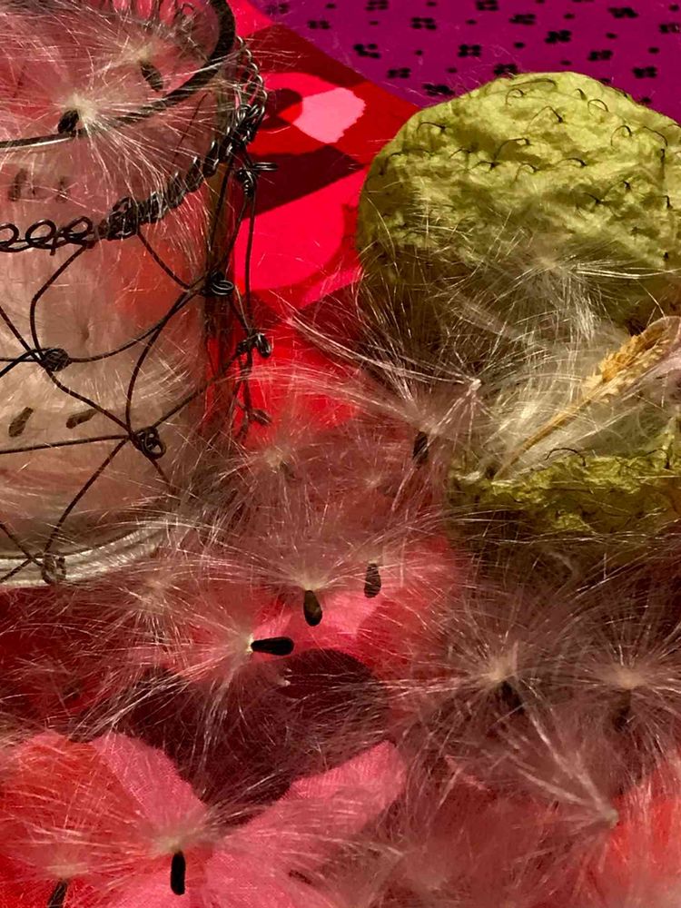 ハロウィンのアレンジに使ったフウセントウワタが弾けて、中からフワフワの種!