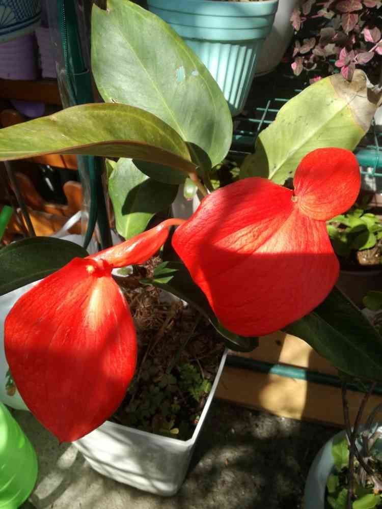アンスリウムと同じ形の赤い部分だけの花もあるのですが、赤く大きい部分の反対側の付け根にもうひとつ赤く小さなのがある花もあります