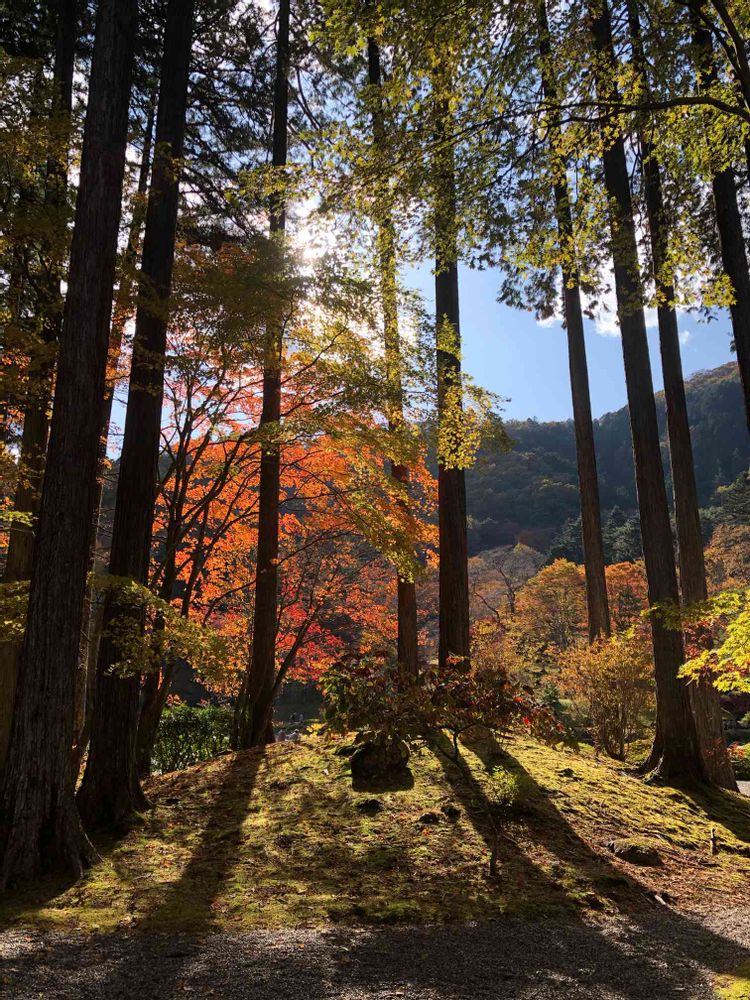 檜の林の中を散策すると、挿し込む陽射しが、赤いもみじ🍁🍁を透けさせて、足元の少し色付きかけた苔のマットを、金色✨に輝かせて✨いる様です🍀‼️