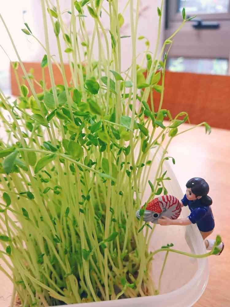 スーパーで買った『豆苗』、タッパーに入れて、2回目を育てております♥️