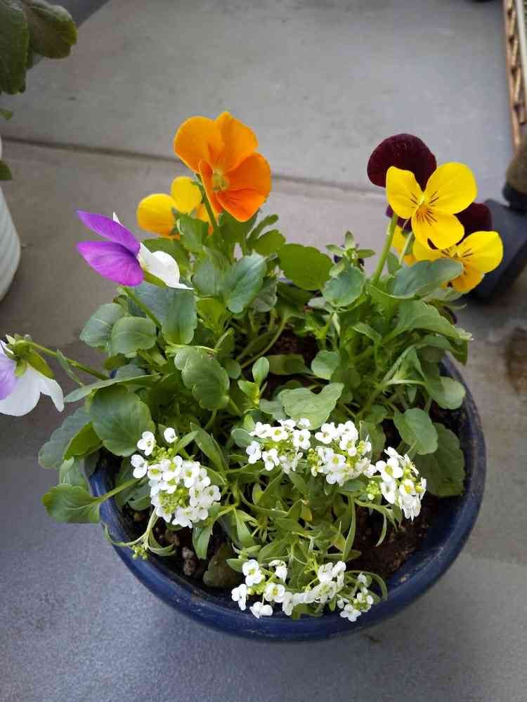 ビオラ何色にしようかな?と迷い小さな寄植えを買いました😊アリッサムがとても引き立ってます!