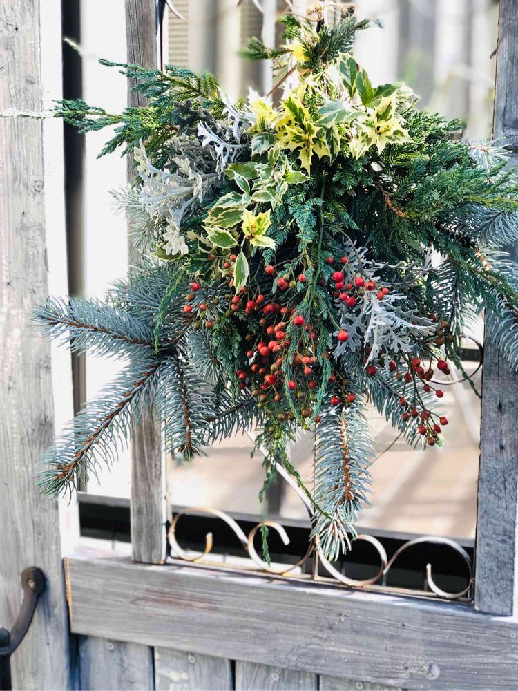 剪定した枝を使ってスワッグを作りました😊テキトーに束ねて結ぶだけですが、クリスマス気分は盛り上がってきました😁