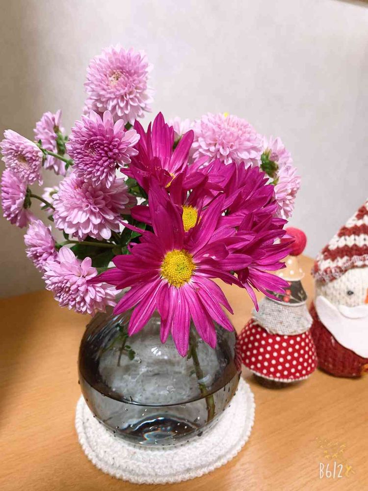 まあるい花瓶にピンクのマムが、可愛いい💗