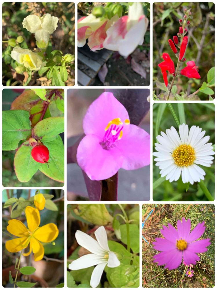 左上と真ん中金魚草、やっと花を開いたパイナップルセージ