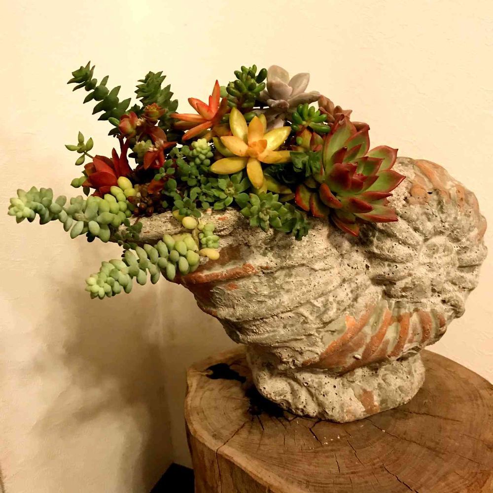 頂きもののアンモナイトの鉢に段々と紅葉して来た子を集めて寄せ植えしました💕