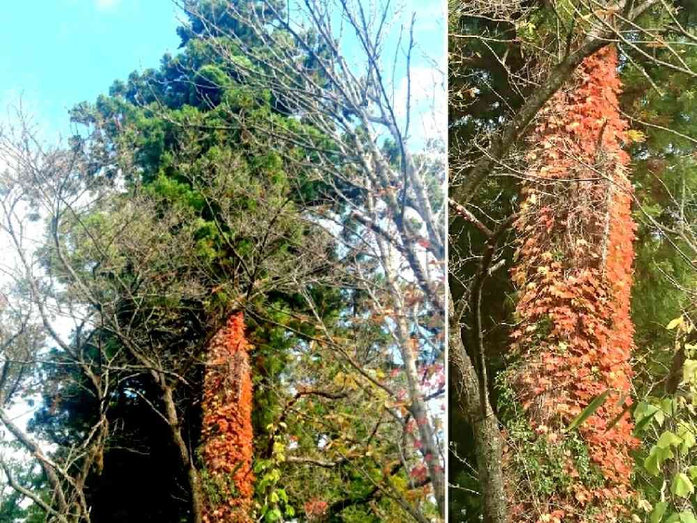 近づいて見てみると、針葉樹の幹を紅葉したつる植物が登っています。