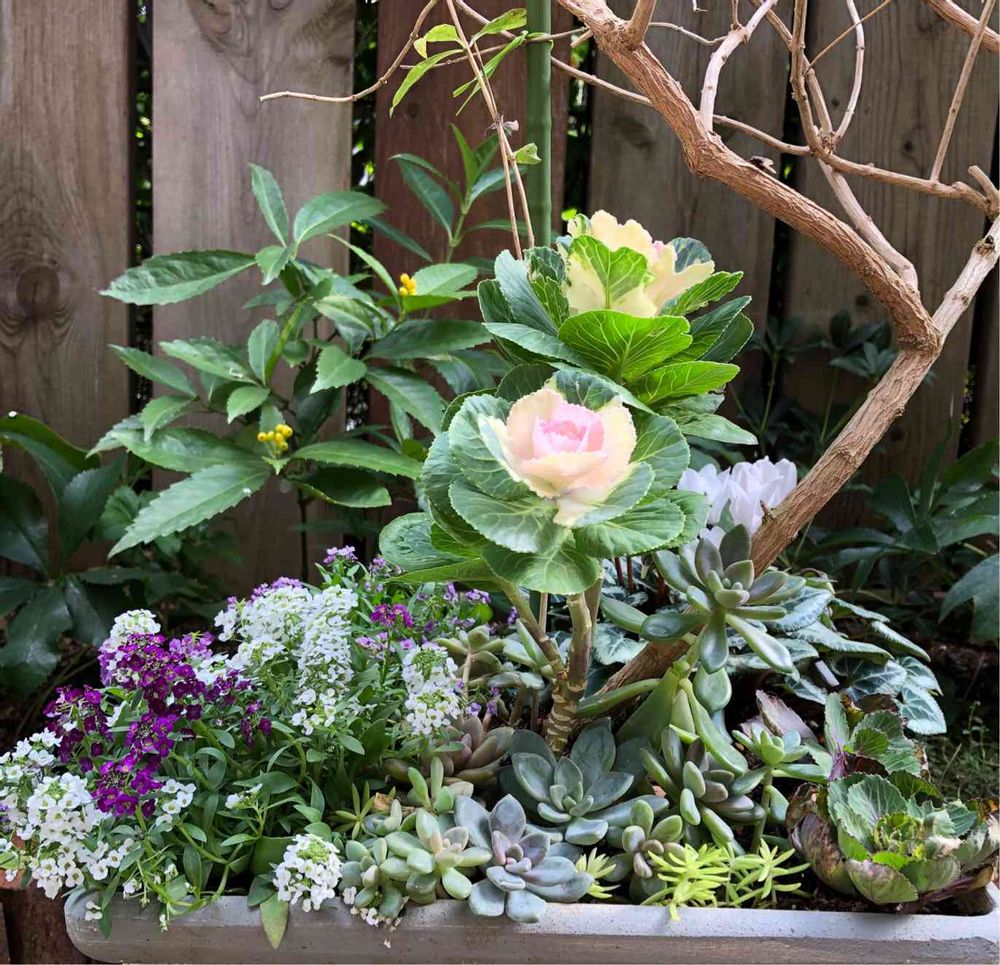 葉牡丹、アリッサムは良く見ますが、多肉が入って斬新ですね💕