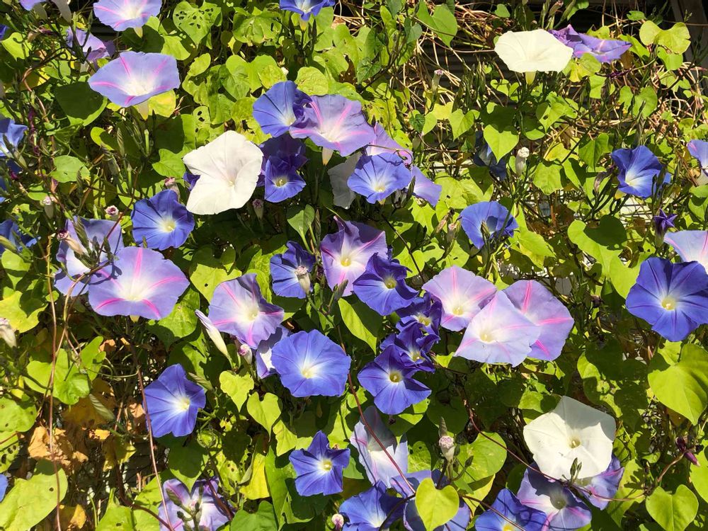 会社のグリーンカーテンのヘブンリーブルーがようやく満開になりました。寒くて昨日の花が残っていて不思議なグラデーションです。