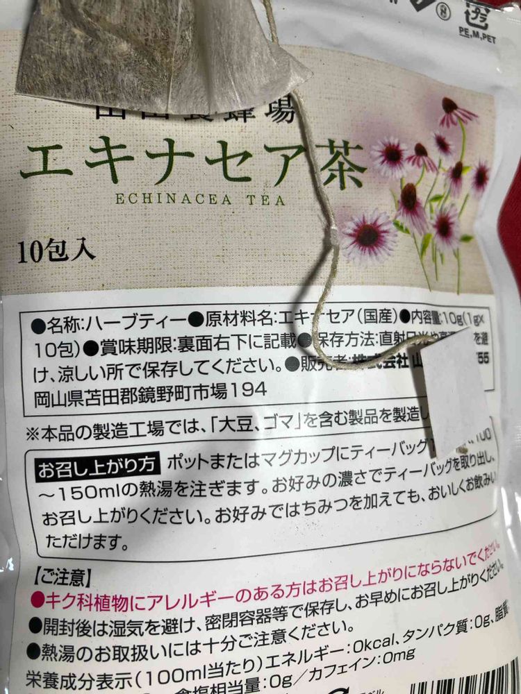 山○養蜂場から商品が届き、試供品の中にローヤルゼリーや蜂蜜入り🍯石鹸等と一緒に入っていたのが「エキナセア茶」なるもの😲