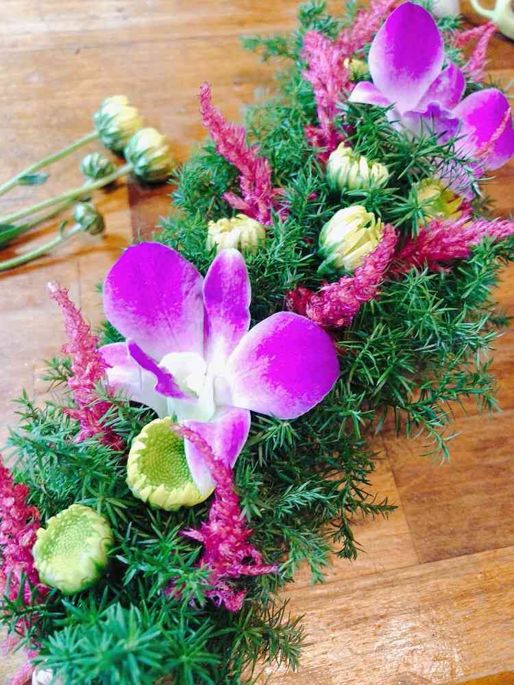 花屋の店頭では、脇枝を捌いて捨ててしまいます。それを集めて レイを編んでみました。ヒムロスギでクリスマス風に🎄