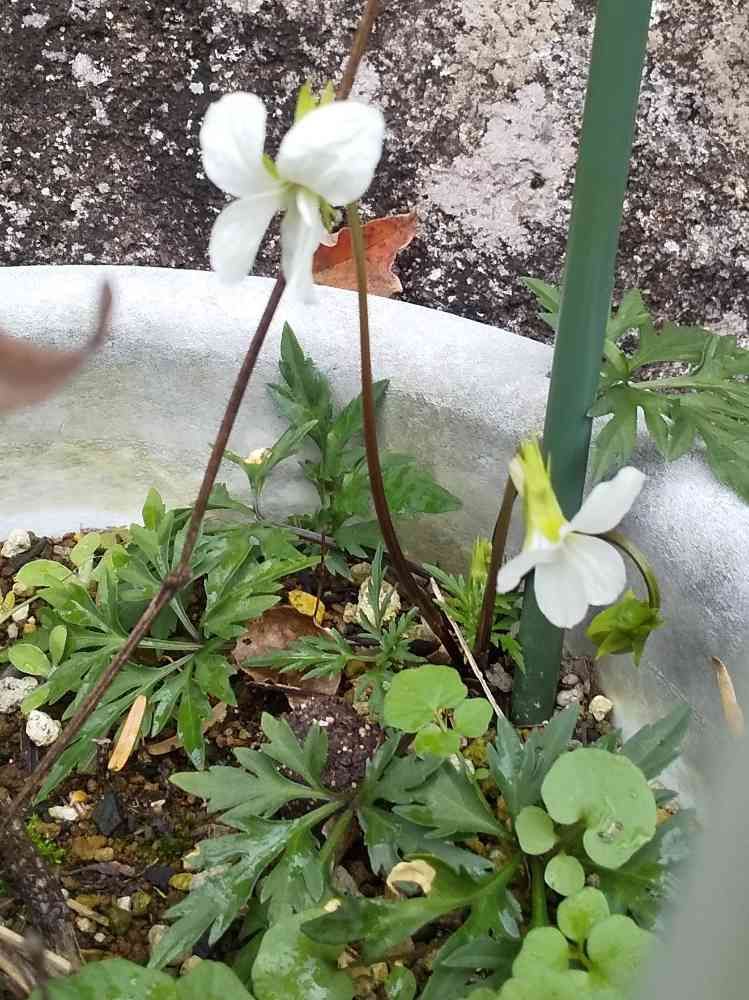 枯れたクレマチスの植木鉢に、小さな白い花が咲いていました。名前を教えてください。