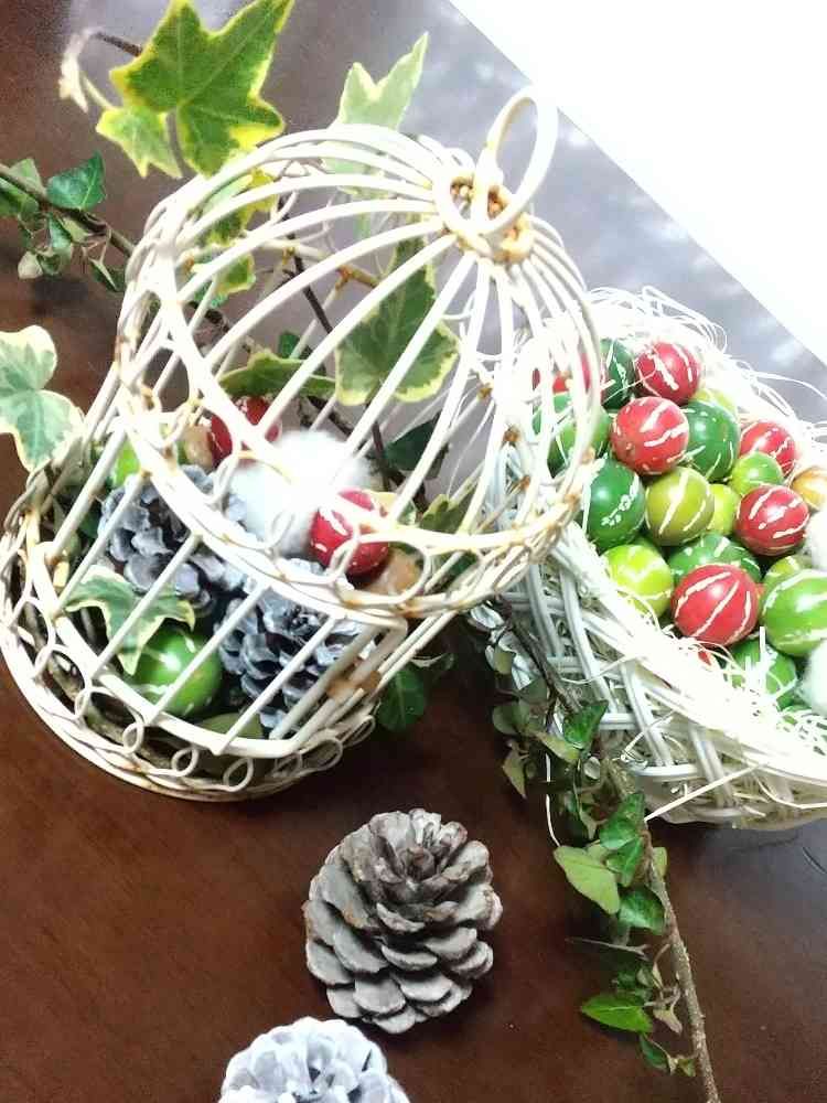 鳥かごにモフモフとリーフと白く塗った松ぼっくりとアレンジ✨
