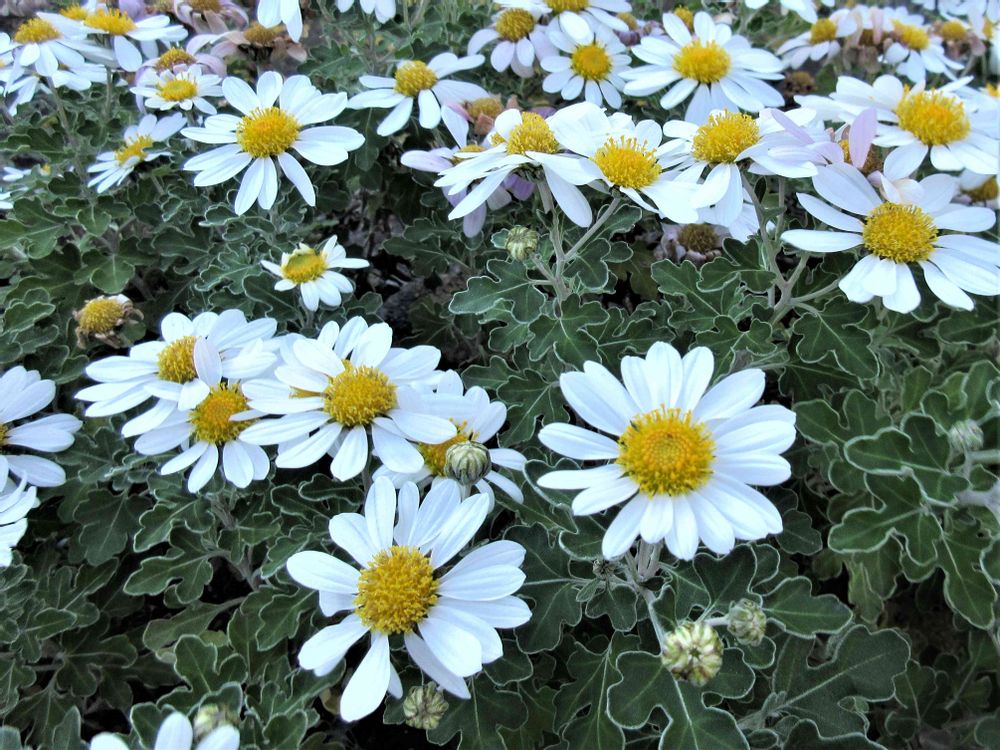イソギクは黄色の花 ハナイソギクは白い花が咲きます。どちらも葉に白縁取りがあり素敵です。