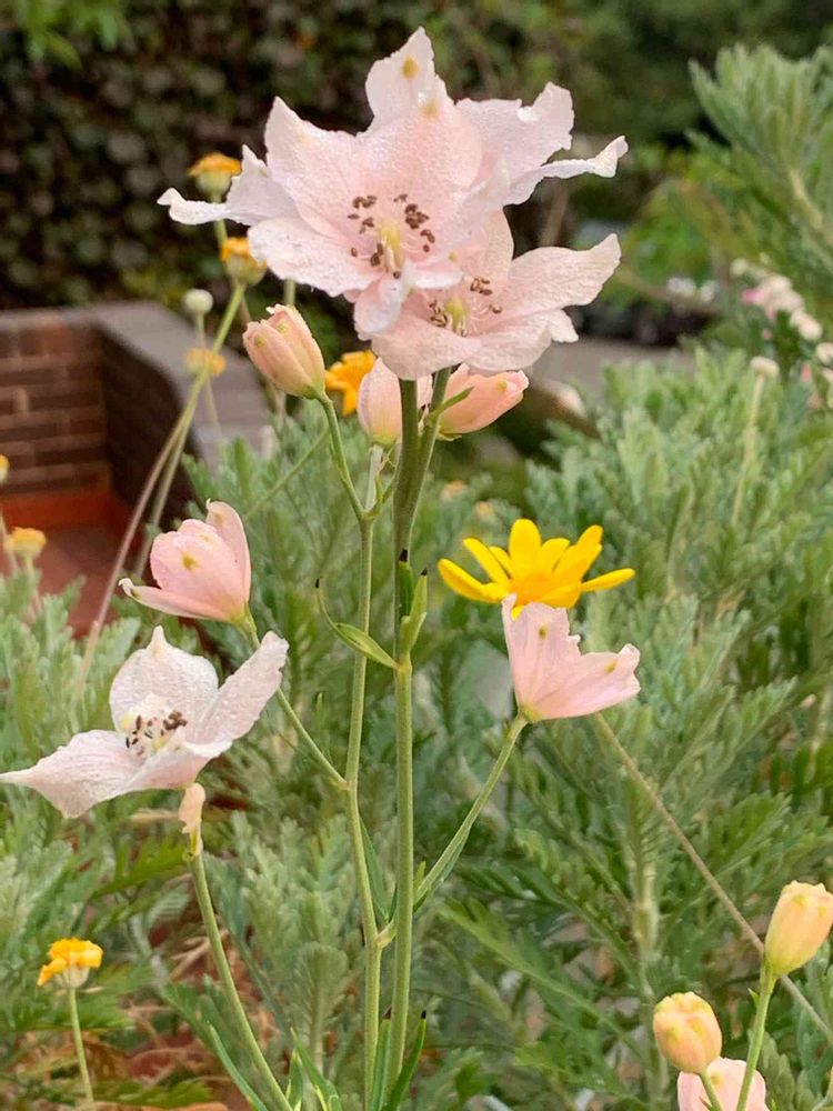 ひとつひとつの花は普通の背の高いデルフィニウムと同じ大きさですが、それが20センチぐらいの茎に散らばって咲いています😊
