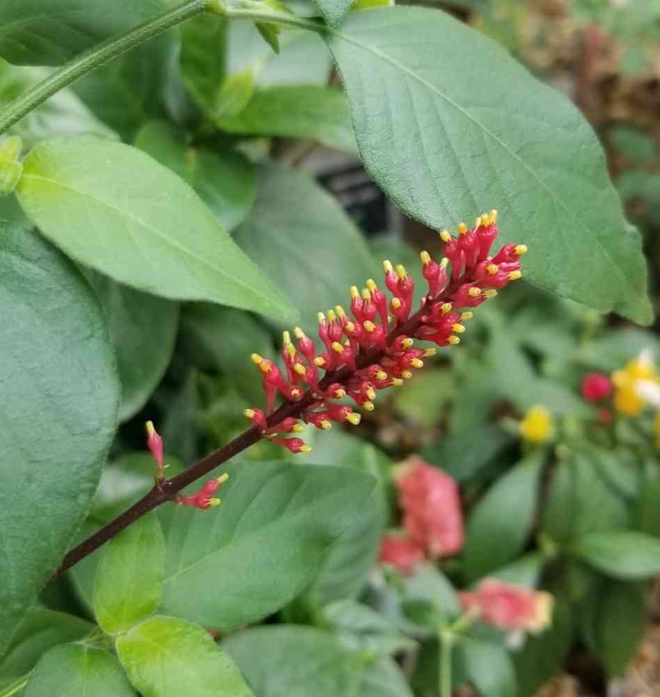キツネノマゴ科で中央アメリカやメキシコ原産。沖縄では野生化。名前の通り、赤い筒状の花穂を次々と出す。