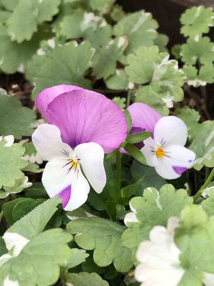 グレコマはじめ見ました。斑入りの葉ですね。ビオラと合いますね。