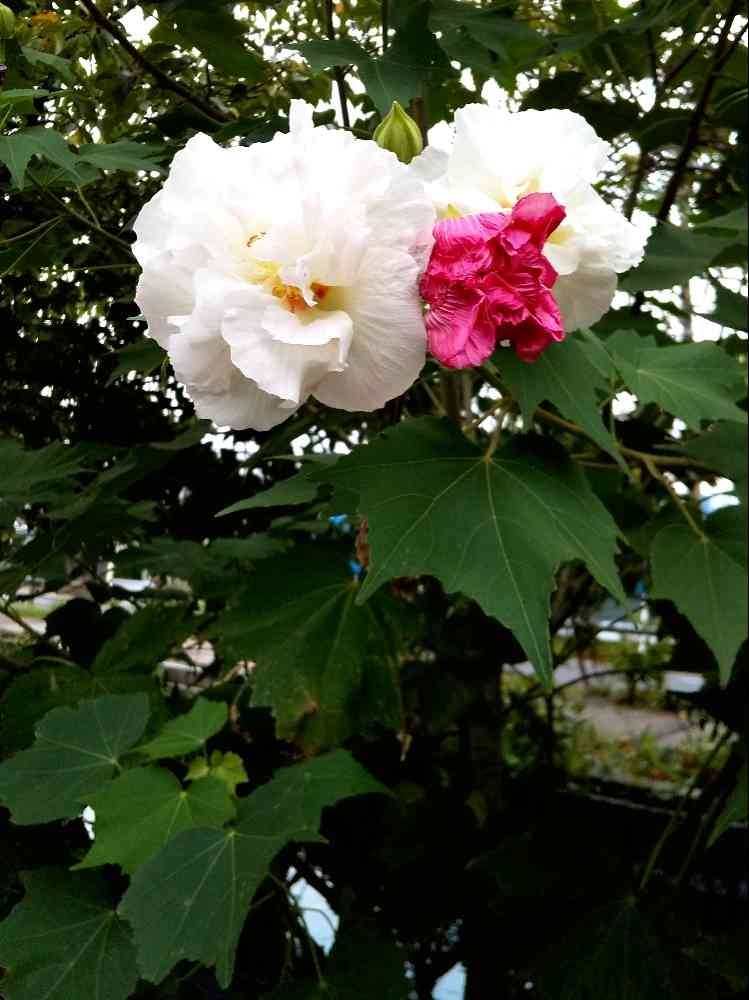 酔芙蓉は朝は白い花を咲かせ時間が経つにつれて赤みを帯びて