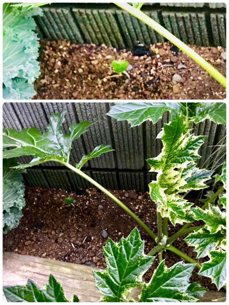 夏のニチニチソウから葉牡丹へ植え替えの際、埋もれていたアカンサスモリスタスマニアエンジェルの子ども発見!