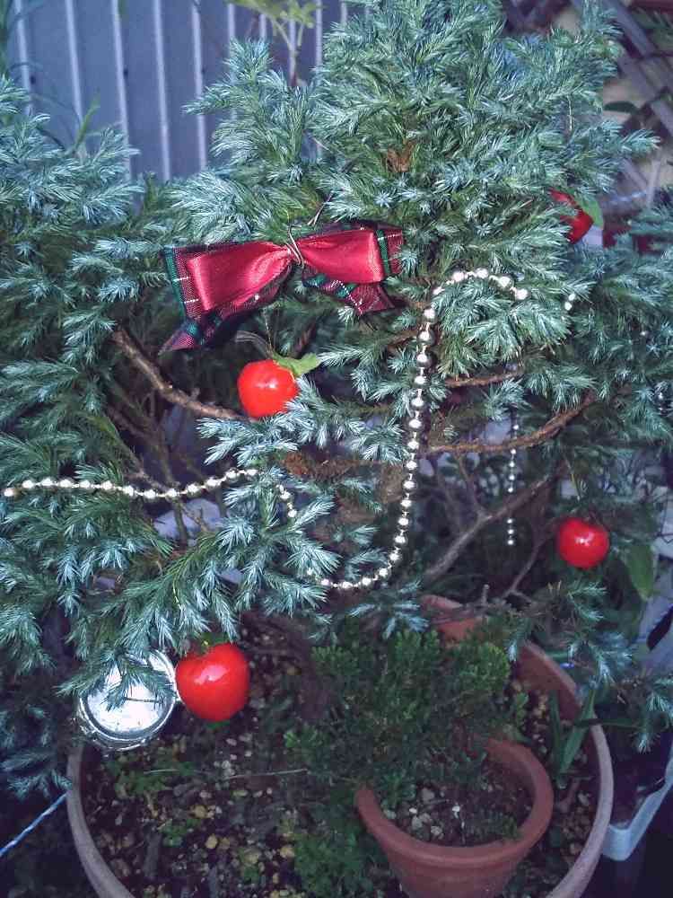 玄関先にある鉢植えのブルーバードに、息子がのクリスマス✨🎄✨の飾りを飾付けてみました❤️😃